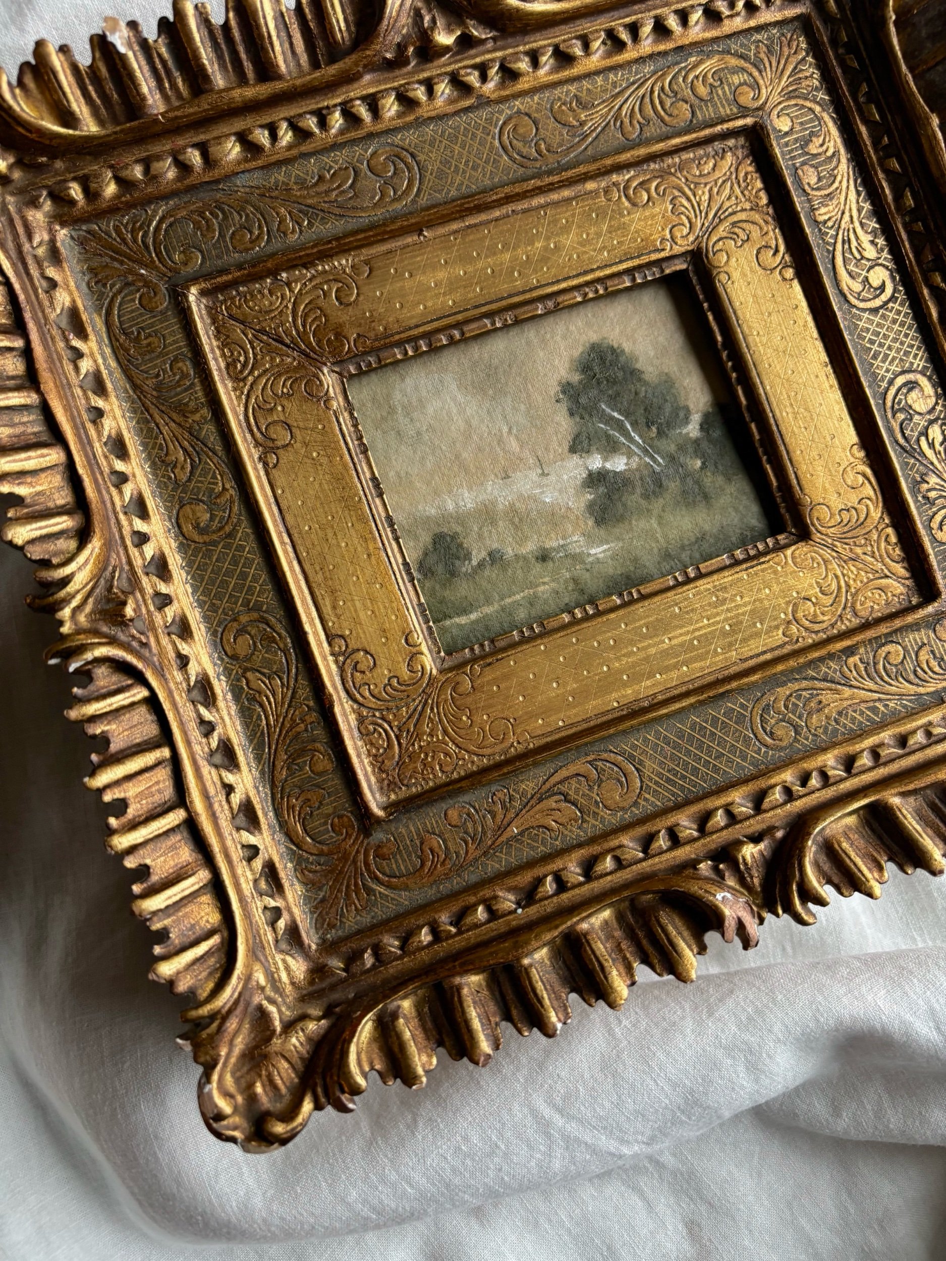 Original oil Landscape painting on handmade 100% cotton rag paper, and framed in a gorgeous antique wood frame with ornate details. Frame has small chips to the detailing, which is due to its age. Painting is treated with an archival varnish to preserve the life of the painting.